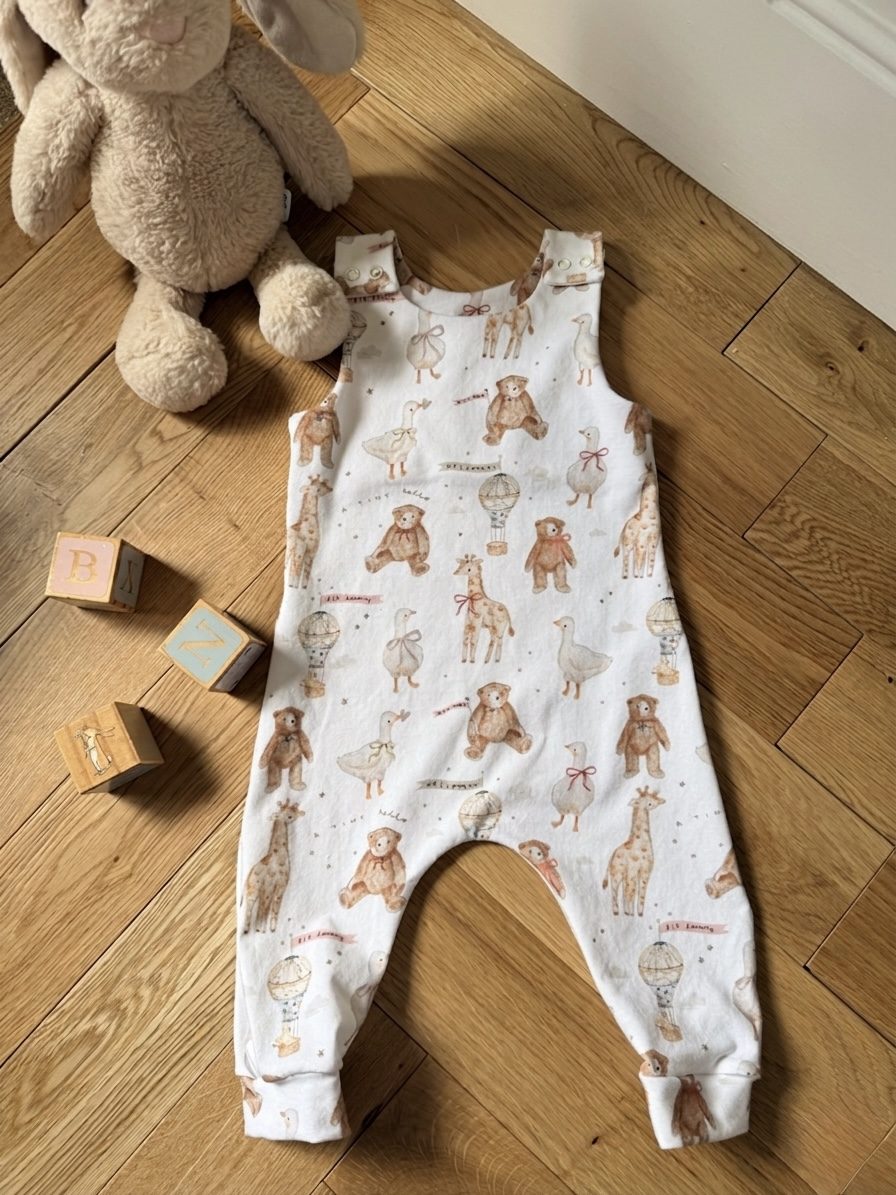 A well-proportioned, harem-style romper with shoulder snap fastenings for easy dressing and changing. The relaxed drop crotch gives plenty of room for cloth and disposable nappies.